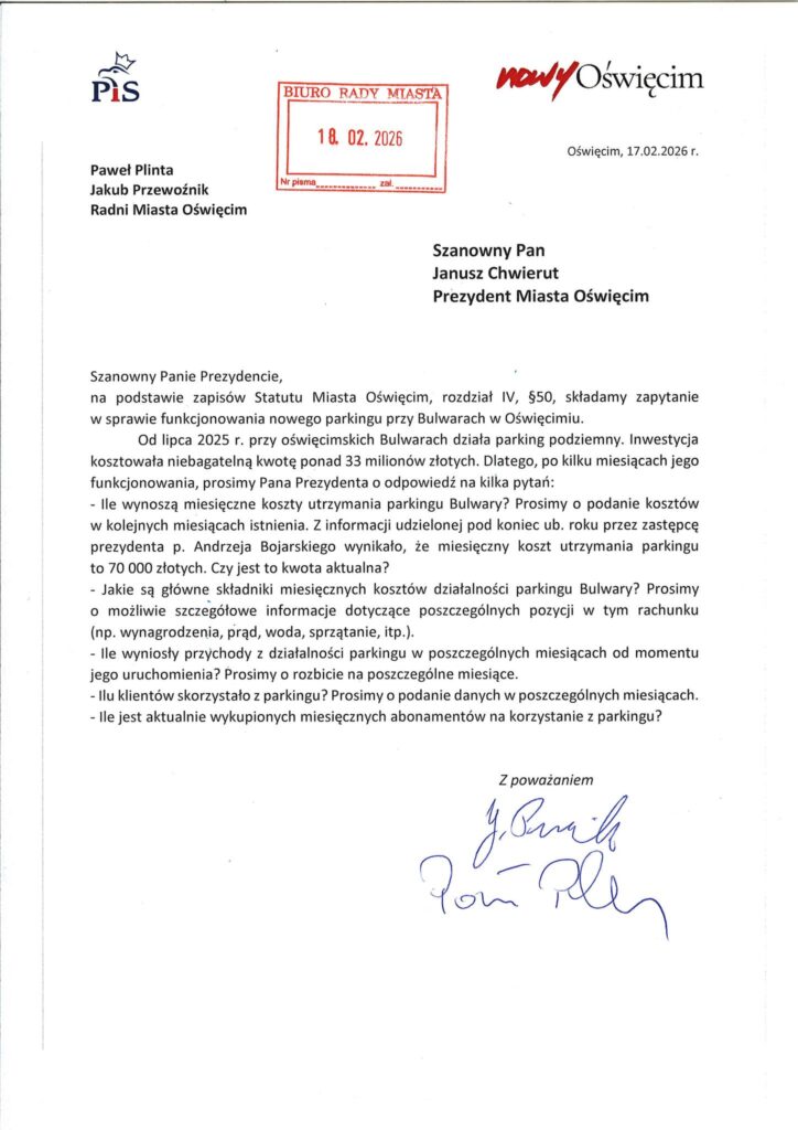 Radni z klubu Prawo i Sprawiedliwość-Nowy Oświęcim skierowali do prezydenta Oświęcimia Janusza Chwieruta oficjalne zapytanie dotyczące kosztów utrzymania oraz przychodów z działalności nowego parkingu przy Bulwarach nad Sołą.