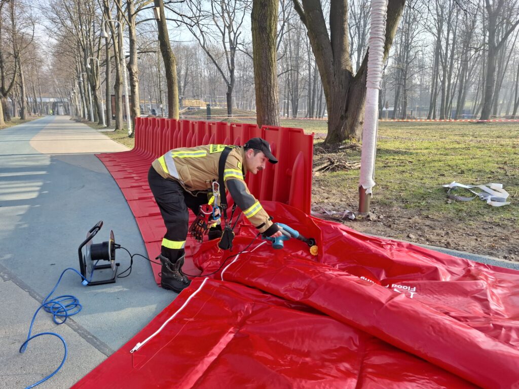 Ćwiczenia przeciwpowodziowe na Bulwarach w Oświęcimiu! Rozkładanie rękawów przeciwpowodziowych – 8 rękawów, zapora 180 metrów. Pracownicy spółek miejskich i OSP testowali montaż i koordynację. Finansowanie: 2 mln zł z Programu Ochrony Ludności i Obrony Cywilnej, wkład własny 170 tys. zł. Sprzęt: ciężarówka z cysterną, motopompa, koparko-ładowarka, dron, syreny, agregaty, rękawy. Wzmocnienie bezpieczeństwa Oświęcimia!
