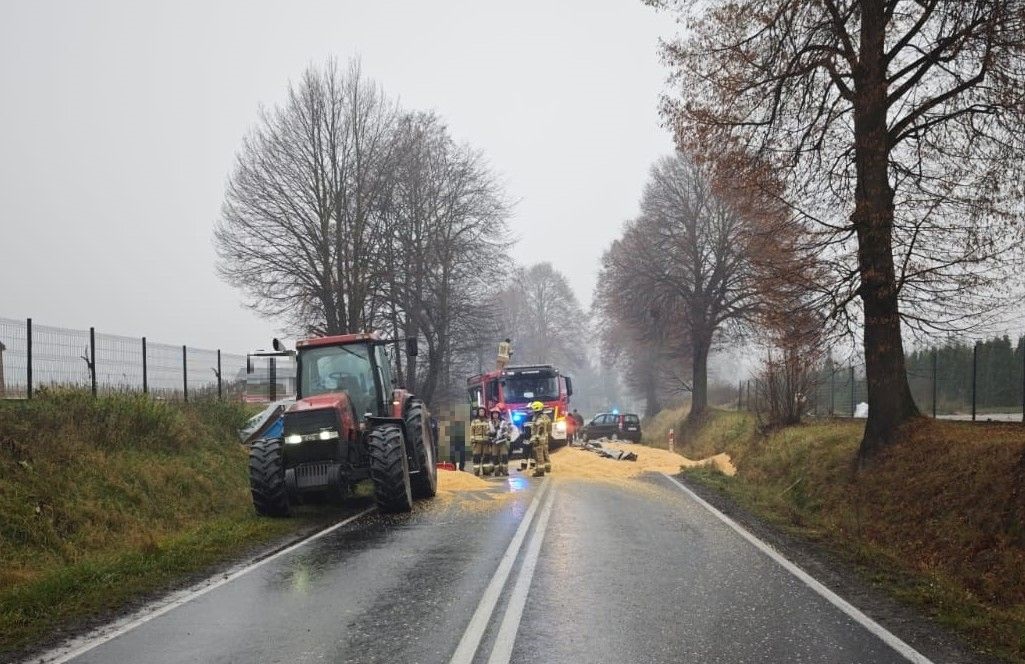 Dziś rano, 17 listopada 2025 roku, tuż po godzinie 8:00 w Przeciszowie na ulicy Krakowskiej (DK44) doszło do poważnych utrudnień. Z przyczepy ciągnika rolniczego na jezdnię wysypała się kukurydza, która całkowicie zablokowała ruch w obu kierunkach.