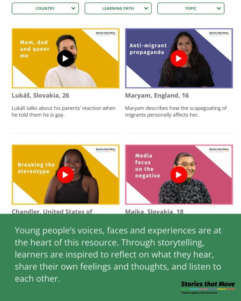 „Stories That Move” to bezpłatne, internetowe narzędzie edukacyjne poświęcone tematom różnorodności, tożsamości i dyskryminacji. Platforma opiera się na autentycznych historiach młodych ludzi i została opracowana przez Anne Frank House we współpracy z międzynarodowymi partnerami edukacyjnymi.