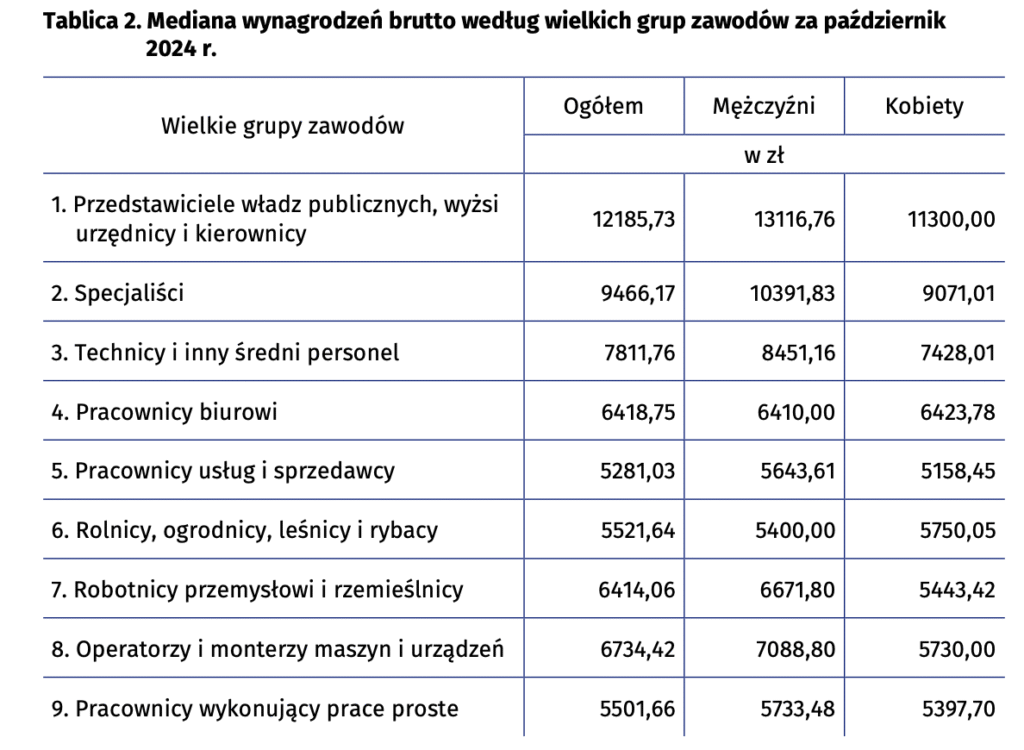 Źródło danych: Główny Urząd Statystyczny, „Struktura wynagrodzeń według zawodów za październik 2024 r.”