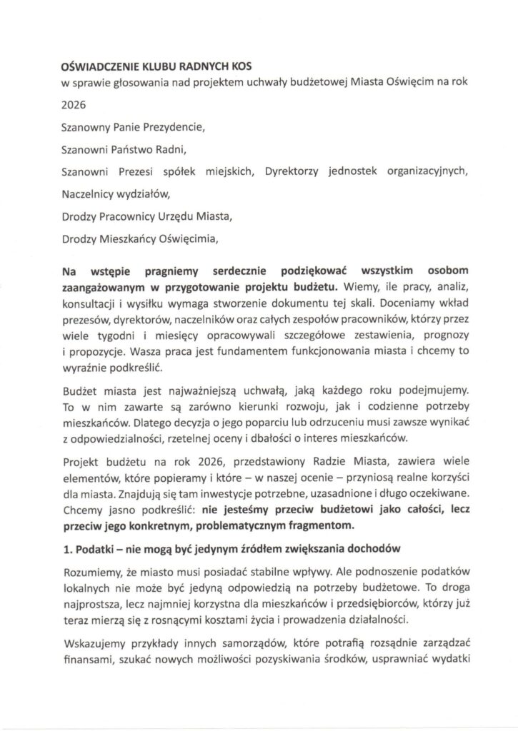 Budżet miasta Oświęcim na 2026 rok został przyjęty, ale dyskusja wokół jego kształtu nie cichnie. Do grona krytyków dołączył kolejny klub radnych, który w oficjalnym oświadczeniu wyraził niepokój dotyczący priorytetów finansowych miasta, sposobu przygotowania dokumentu oraz braku szerokiego dialogu społecznego.