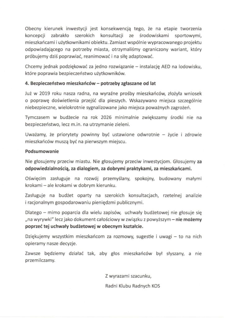 W swoim stanowisku radni KOS 2018 jasno zaznaczają, że nie odrzucają idei rozwoju ani potrzeby stabilnych finansów miasta. Wskazują jednak na kilka obszarów, które ich zdaniem wymagają zasadniczej korekty.
