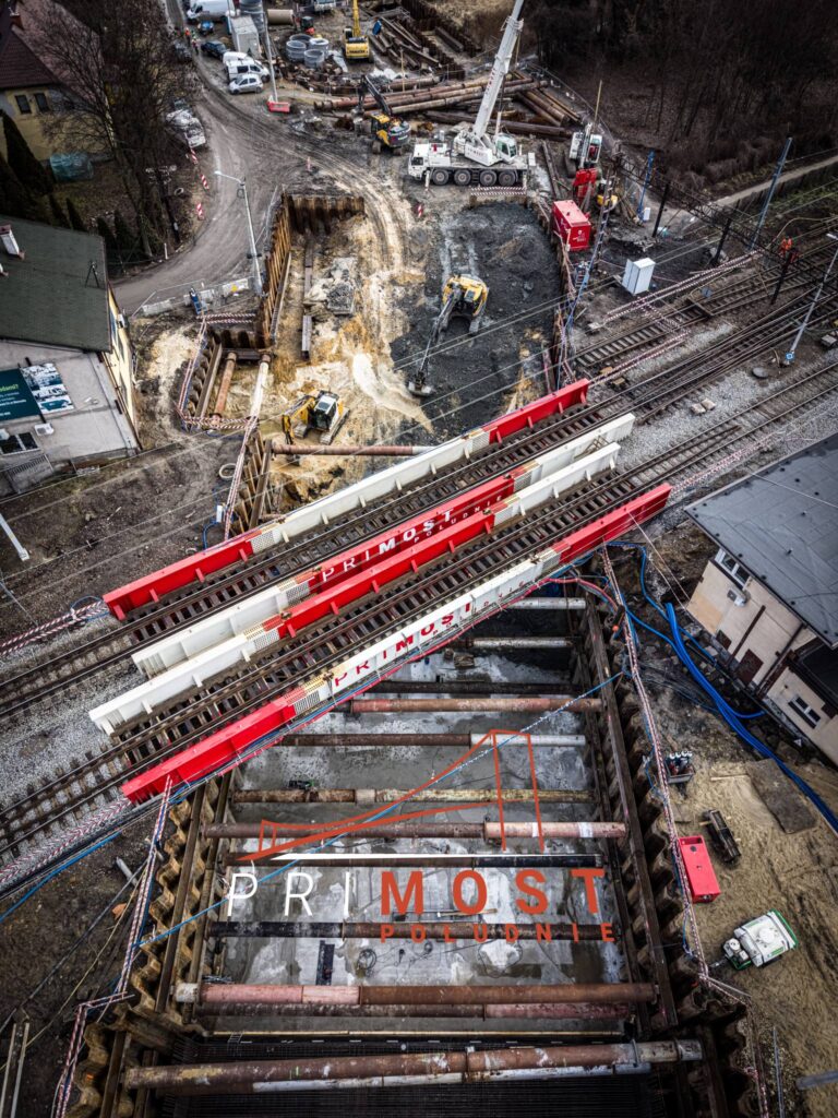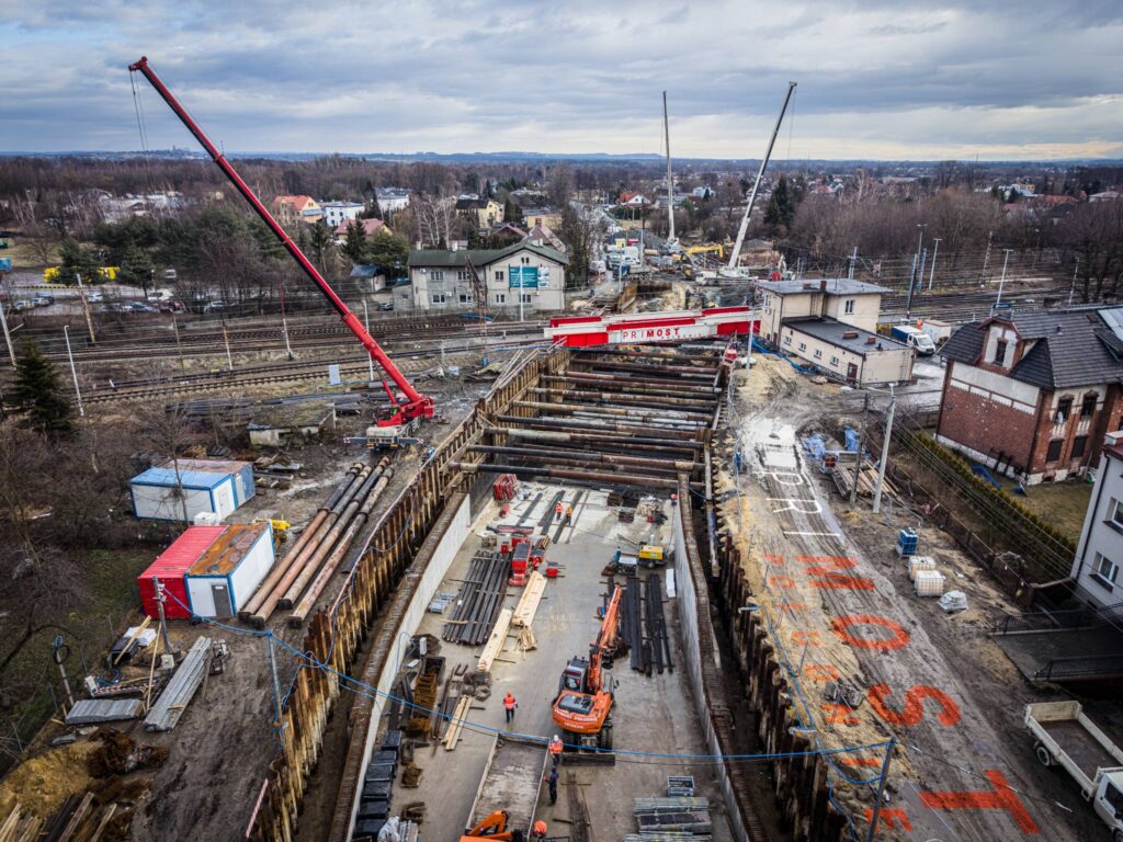 Na budowie trwają prace ziemne pod zasadnicze elementy tunelu pod torami PKP. Co ważne – ruch pociągów nie jest wstrzymany, ponieważ wszystkie prace wykonywane są pod konstrukcjami odciążającymi, umożliwiając tym samym jazdę pociągów zgodnie z rozkładem.