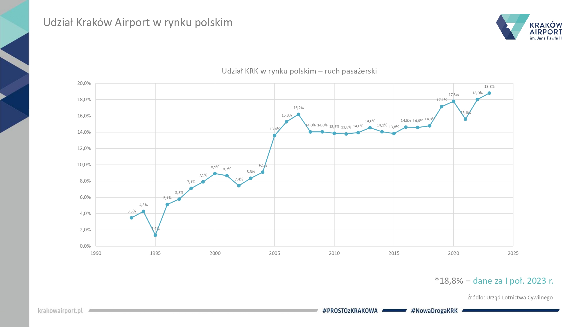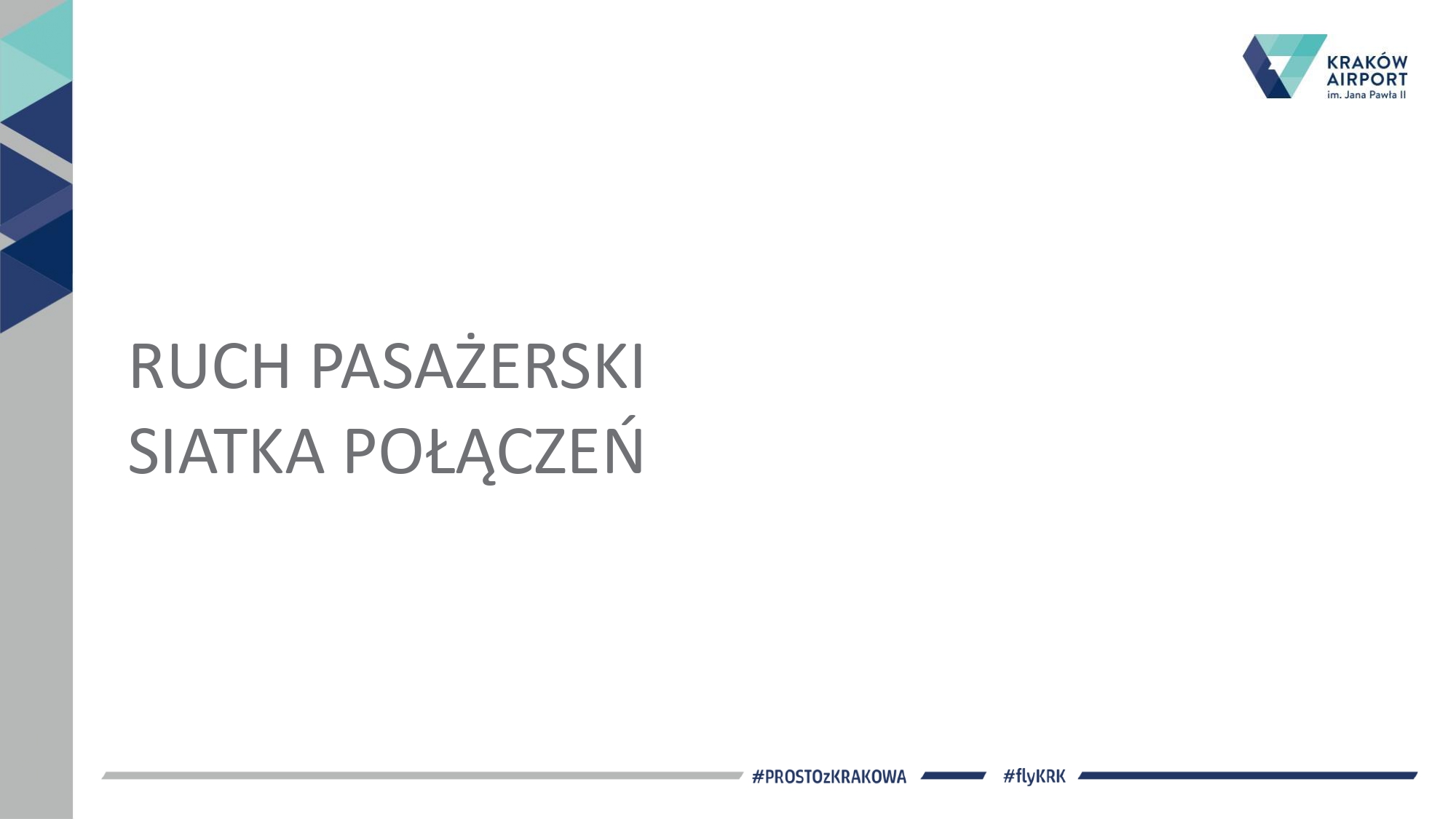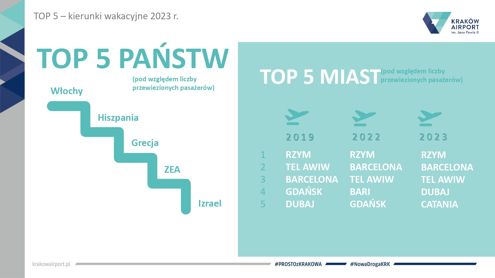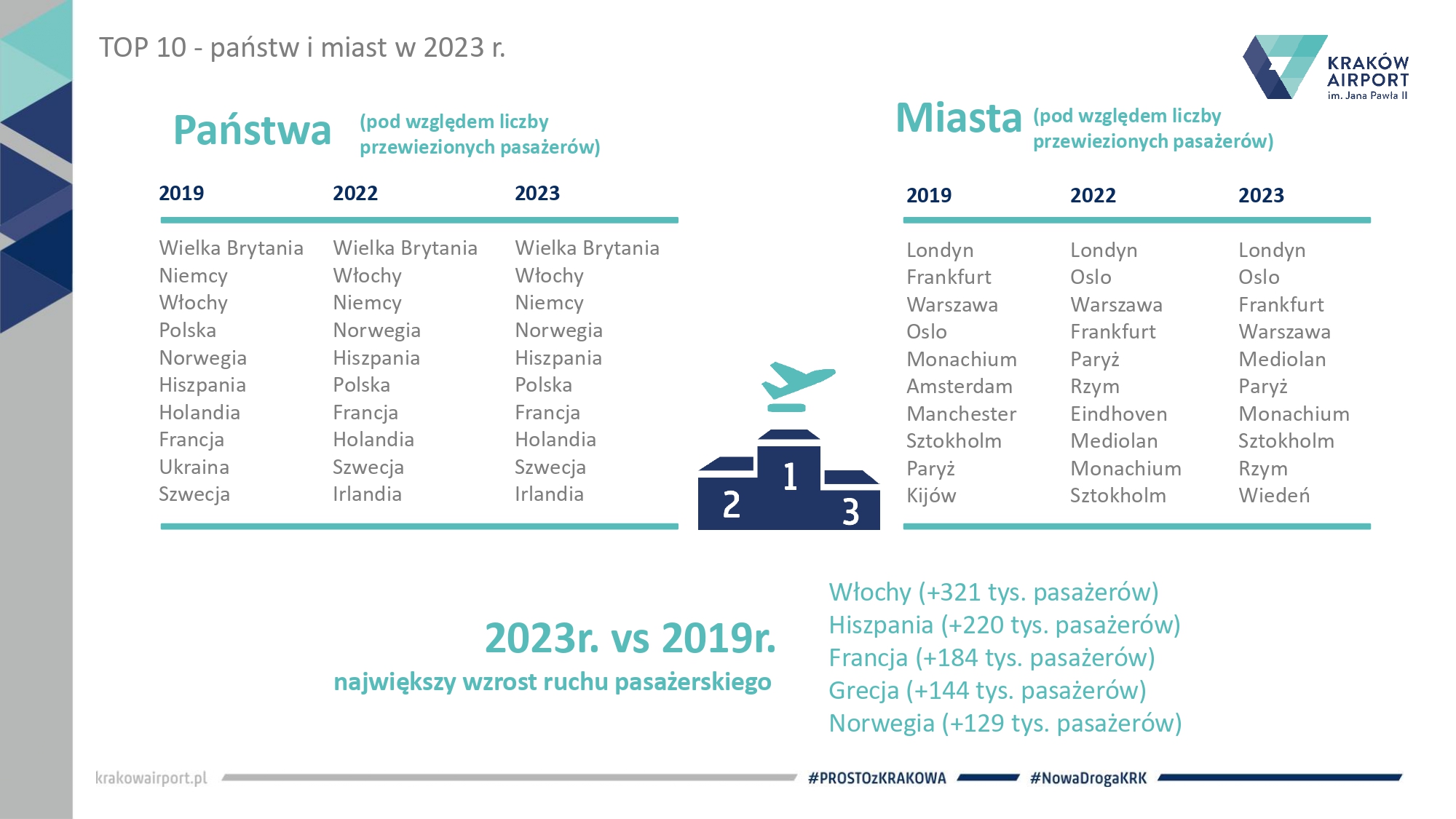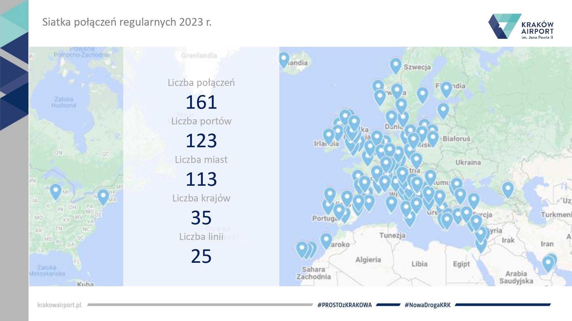 Ruch pasażerski w 2023 roku na krakowskim lotnisku sukcesywnie wzrastał, we współpracy z 25 liniami lotniczymi oferowaliśmy łącznie ponad 161 regularnych połączeń. Priorytetem była odbudowa siatki połączeń sprzed pandemii a także otwarcie się na nowe destynacje. Zainaugurowaliśmy wiele atrakcyjnych połączeń – w tym długo oczekiwane połączenie do Stambułu, oferowane przez PLL LOT i Turkish Airlines.Rozpoczęliśmy również współpracę z Sun Express, Air Dolomiti, Air Serbia czy Pegasus Airlines. Nowe państwa na mapie połączeń #PROSTOzKRAKOWA to Albania,Turcja i Serbia. Zwiększane były również częstotliwości oferowania połączeń przez wielu przewoźników w odpowiedzi na oczekiwania oraz potrzeby naszych pasażerów. Podobnie jak w 2022 r. pasażerowie najchętniej wybierali podróż do Wielkiej Brytanii, Włoch, czy Niemiec i Hiszpanii. Ulubione miasta pasażerów pod względem przewiezionych pasażerów to kolejno: Londyn, Oslo, Warszawa. W letniej siatce połączeń duża popularnością jak co roku cieszyły się kierunki włoskie, hiszpańskie, tureckie. Ze słonecznych miast pasażerowie najchętniej wybierali Rzym, Barcelonę i Tel Awiw. Dużym uznaniem cieszyły się loty do Nowego Yorku i Chicago oferowane przez PLL LOT a także loty krajowe oferowane przez dwóch bazowych przewoźników. Z PLL LOT polecieć możemy do Warszawy oraz do portu lotniczego Olsztyn-Mazury Ryanair umożliwia natomiast podróż do Gdańska oraz Poznania.
