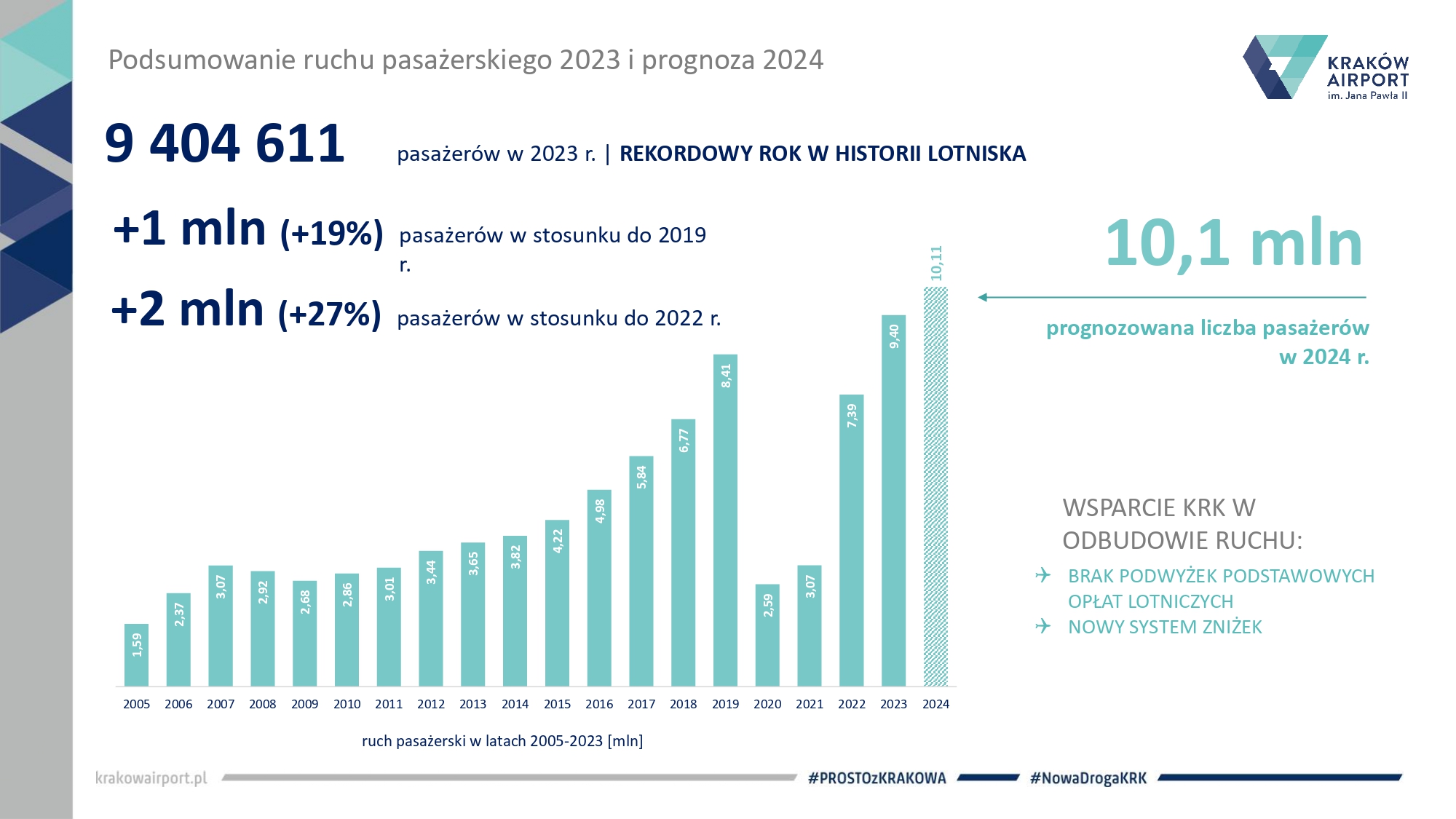 „Rok 2023 zakończyliśmy historycznym wynikiem: jako pierwszy port regionalny obsłużyliśmy ponad 9 milionów pasażerów w ciągu jednego roku. Rok 2024 rozpoczynamy z mocnym nastawieniem na dalszy rozwój krakowskiego lotniska. Jako zarząd MPL jesteśmy przekonani, że przygotowaliśmy dla pasażerów różnorodną i atrakcyjną siatkę połączeń #PROSTOzKRAKOWA na 2024 rok , dzięki której przekroczymy barierę 10 milionów pasażerów i w ten sposób szacujemy, że wygenerujemy pół miliarda przychodu. W tym jubileuszowym roku, pragnę zatem podziękować wszystkim pracownikom Kraków Airport, liniom lotniczym, agentom handlingowym, ULC, PAŻP, wojsku i służbom państwowym współpracujących z nami każdego dnia, wszystkim partnerom i instytucjom sektora lotniczego i około lotniczego oraz całej branży turystycznej Małopolski i Krakowa za wkład w rozwój krakowskiego lotniska.- powiedział Radosław Włoszek, prezes zarządu Kraków Airport.