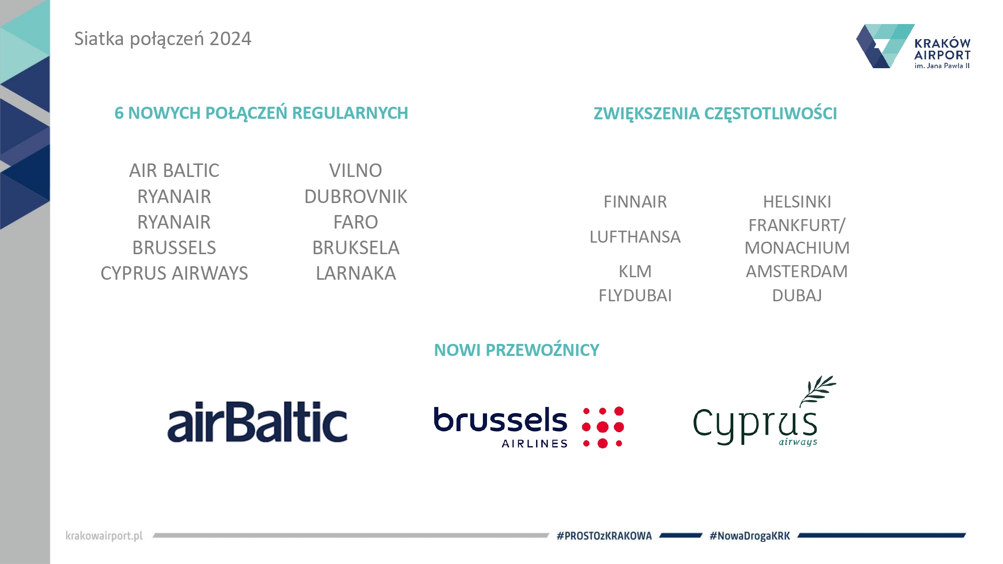W 2024 planowanych jest nowych 6 połączeń regularnych. Nasz bazowy przewoźnik Ryanair uruchomi połączenia do Dubrownika i Faro, Air Baltic do Wilna a Brussels Airlines do Brukseli. Od sezonu letniego 2024 roku Cyprus Airways uruchomią nowe połączenie #PROSTOzKRAKOWA do Larnaki,