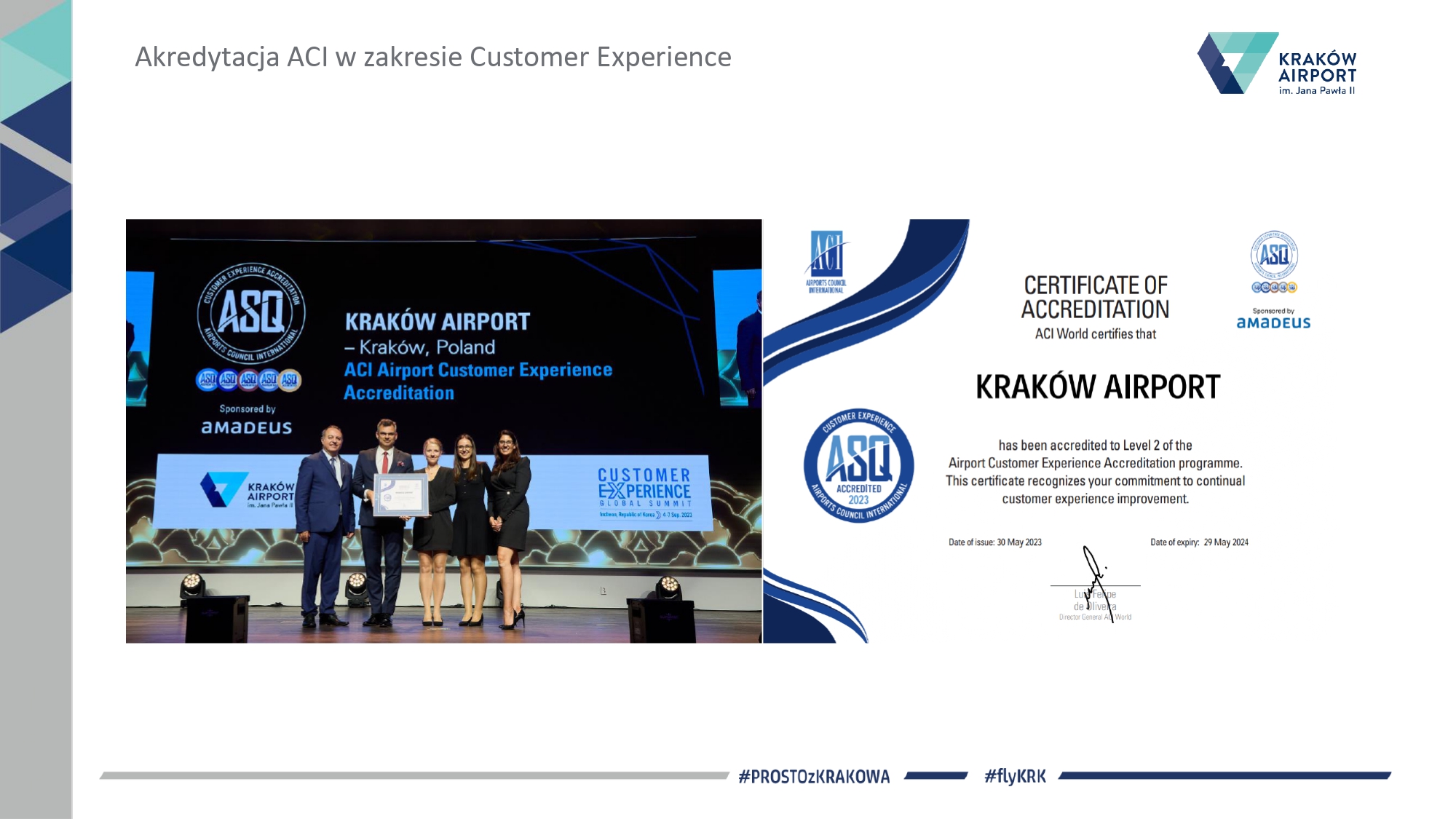 W roku 2022 Kraków Airport uzyskało przedłużenie 2 poziomu akredytacji ACI Airport Customer Experience przyznawanej przez ACI World. Akredytacja przyznawana jest portom lotniczym, które w swojej działalności dążą do podnoszenia standardów obsługi podróżujących, dla których najważniejsze jest bezpieczeństwo i komfort pasażerów. Wyróżnienie to pozwala na obiektywne potwierdzenie wysokiej jakości świadczonych przez Kraków Airport usług i jest sygnałem dla podróżnych, że priorytetowo traktujemy pasażera i jego potrzeby.