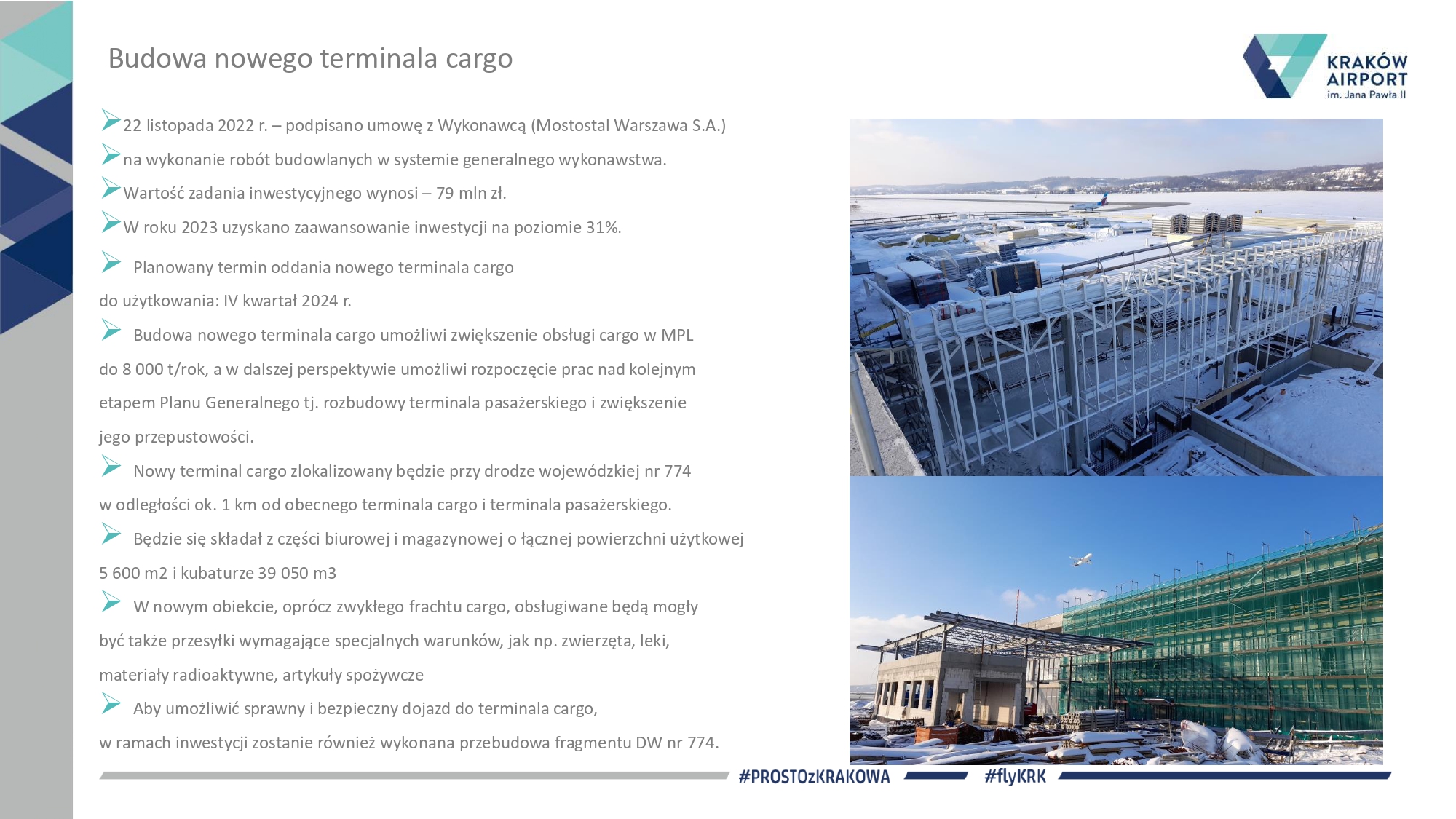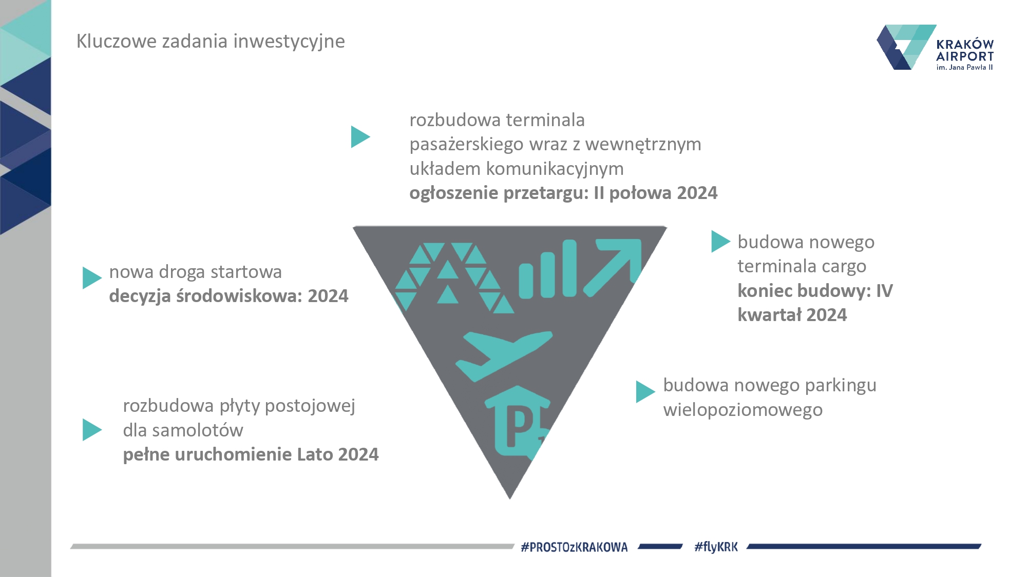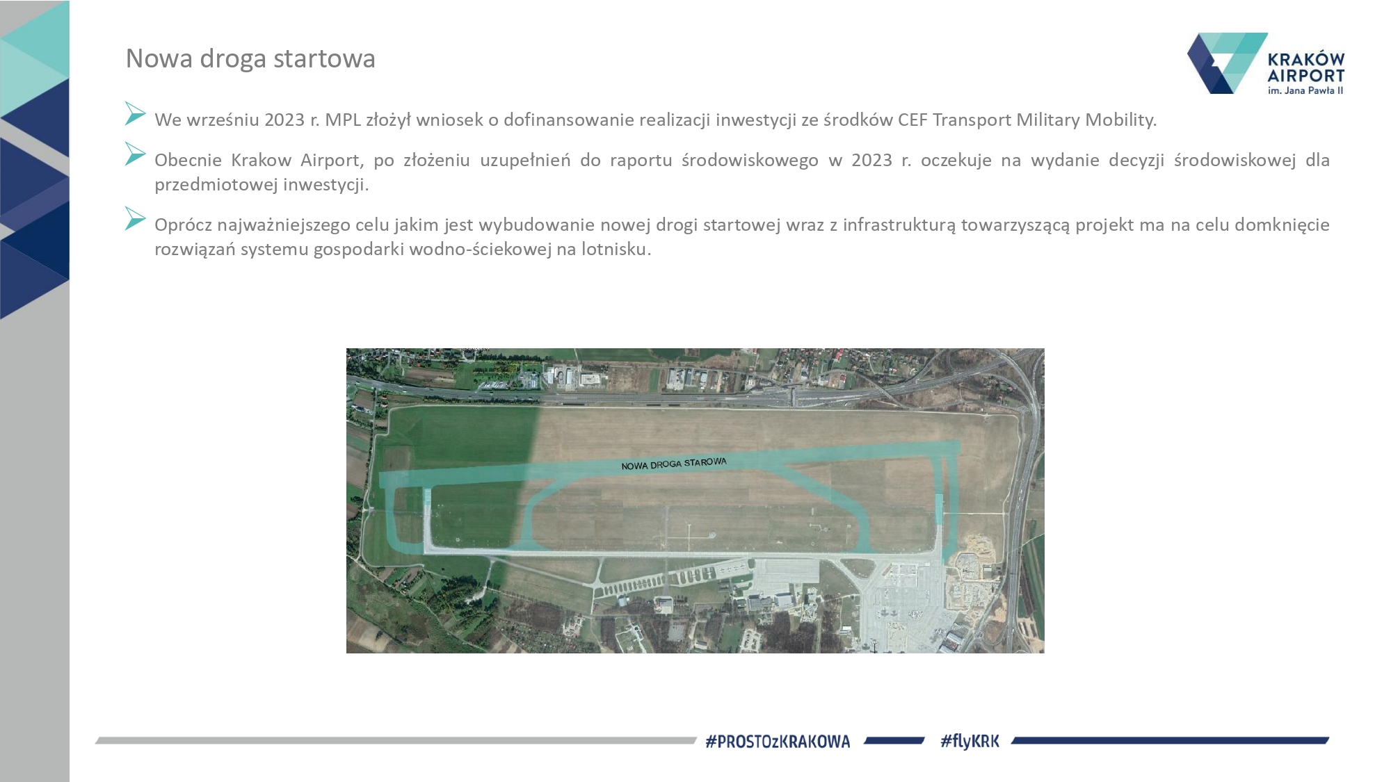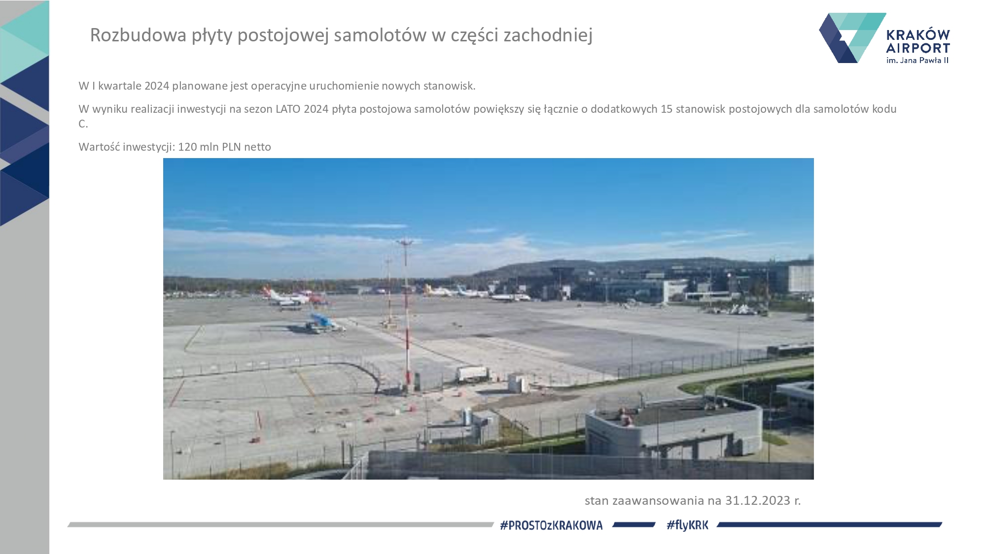 „Konsekwentnie realizujemy inwestycje ujęte w Planie Generalnym lotniska Kraków-Balice. W 2023 rozbudowaliśmy płytę postojową lotniska, trwają zaawansowane prace w budowie terminala cargo i obiektów infrastruktury towarzyszącej.Pod koniec grudnia wspólnicy Spółki Międzynarodowego Portu Lotniczego im. Jana Pawła II Kraków – Balice sp. z o. o. jednogłośnie zaakceptowali przedłożony przez zarząd „Plan Inwestycyjny Kraków Airport na lata 2024 – 2045”. Podjęta decyzja jest podstawą formalną dalszych planów rozwoju krakowskiego lotniska i realizacji Planu Inwestycyjnego na dalsze dekady zgodnie z Planem Generalnym zatwierdzonym w 2018r. Podjęto także uchwałę o wyrażeniu zgody na podjęcie przez Zarząd MPL czynności prawnych związanych z realizacją budowy i rozbudowy terminala pasażerskiego. Jedną z najważniejszych inwestycji pozostaje nowa droga startowa, która ponownie procedowana jest w Regionalnej Dyrekcji Ochrony Środowiska. Czekamy na decyzję, będąc gotowym do rozpoczęcia realizacji powyższej inwestycji. Budowa nowej drogi startowej umożliwia ciągłość funkcjonowania krakowskiego lotniska, bez konieczności jego zamykania na wiele miesięcy. Ta budowa, podobnie, jak rozbudowa terminala pasażerskiego, czy pozostałe projekty będą się toczyły przy nieprzerwanie funkcjonującym lotnisku. To także inwestycja domykająca procedowane rozwiązania systemu gospodarki wodno-ściekowej na lotnisku, a także wdrożenie nowoczesnego systemu naprowadzania samolotów, umożliwiającego prowadzenie operacji lotniczych w warunkach ograniczonej widzialności. – podsumował Radosław Włoszek, prezes Zarządu Kraków Airport.