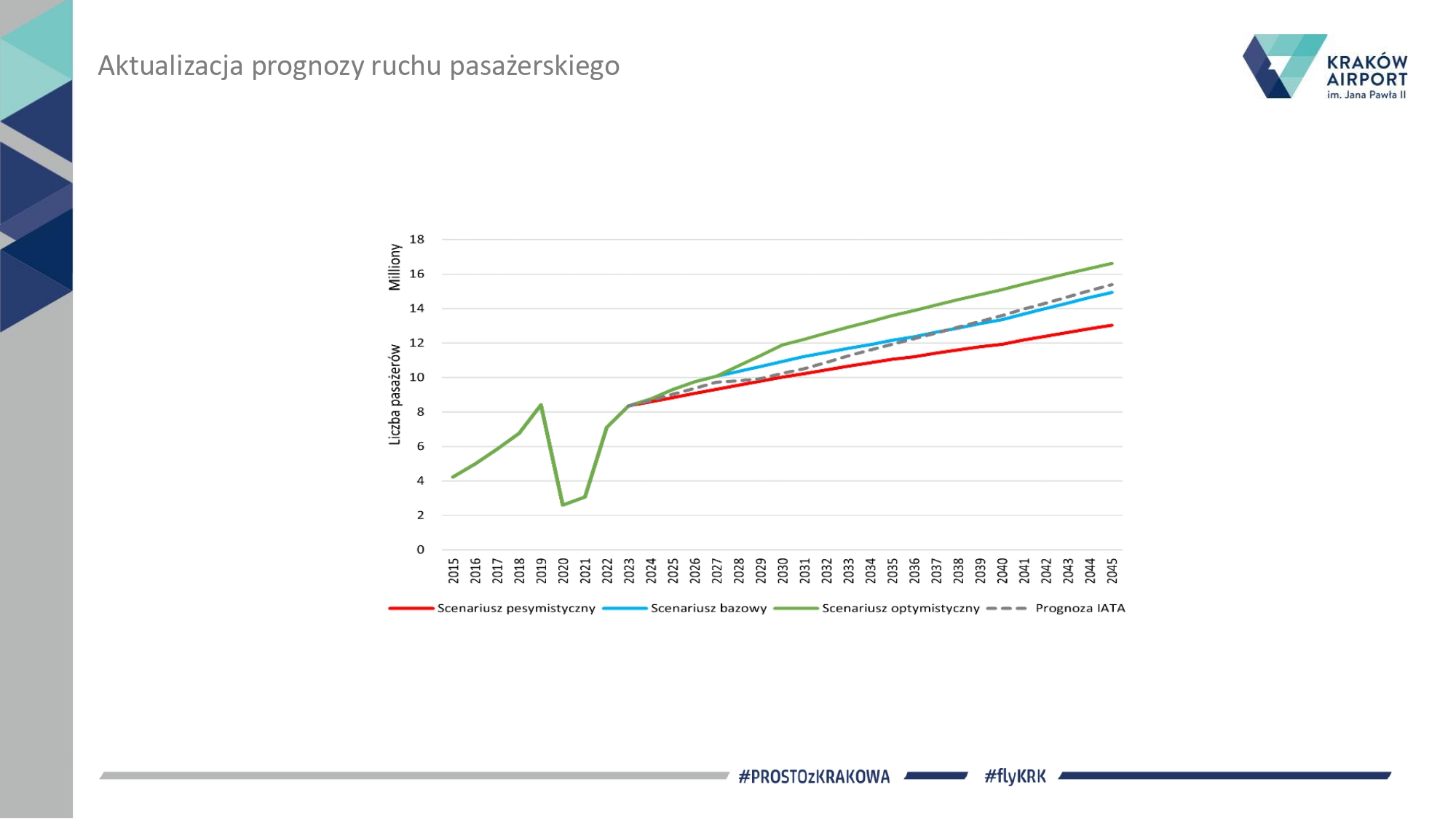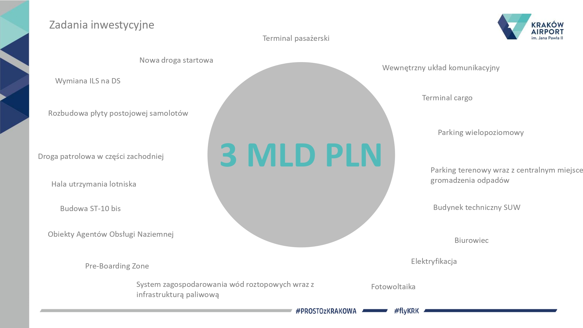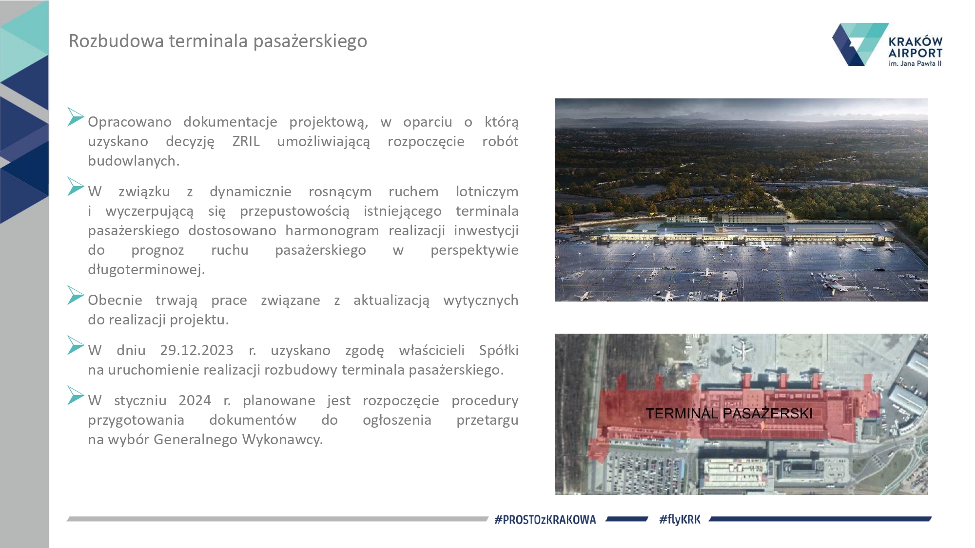 „Konsekwentnie realizujemy inwestycje ujęte w Planie Generalnym lotniska Kraków-Balice. W 2023 rozbudowaliśmy płytę postojową lotniska, trwają zaawansowane prace w budowie terminala cargo i obiektów infrastruktury towarzyszącej.Pod koniec grudnia wspólnicy Spółki Międzynarodowego Portu Lotniczego im. Jana Pawła II Kraków – Balice sp. z o. o. jednogłośnie zaakceptowali przedłożony przez zarząd „Plan Inwestycyjny Kraków Airport na lata 2024 – 2045”. Podjęta decyzja jest podstawą formalną dalszych planów rozwoju krakowskiego lotniska i realizacji Planu Inwestycyjnego na dalsze dekady zgodnie z Planem Generalnym zatwierdzonym w 2018r. Podjęto także uchwałę o wyrażeniu zgody na podjęcie przez Zarząd MPL czynności prawnych związanych z realizacją budowy i rozbudowy terminala pasażerskiego. Jedną z najważniejszych inwestycji pozostaje nowa droga startowa, która ponownie procedowana jest w Regionalnej Dyrekcji Ochrony Środowiska. Czekamy na decyzję, będąc gotowym do rozpoczęcia realizacji powyższej inwestycji. Budowa nowej drogi startowej umożliwia ciągłość funkcjonowania krakowskiego lotniska, bez konieczności jego zamykania na wiele miesięcy. Ta budowa, podobnie, jak rozbudowa terminala pasażerskiego, czy pozostałe projekty będą się toczyły przy nieprzerwanie funkcjonującym lotnisku. To także inwestycja domykająca procedowane rozwiązania systemu gospodarki wodno-ściekowej na lotnisku, a także wdrożenie nowoczesnego systemu naprowadzania samolotów, umożliwiającego prowadzenie operacji lotniczych w warunkach ograniczonej widzialności. – podsumował Radosław Włoszek, prezes Zarządu Kraków Airport.