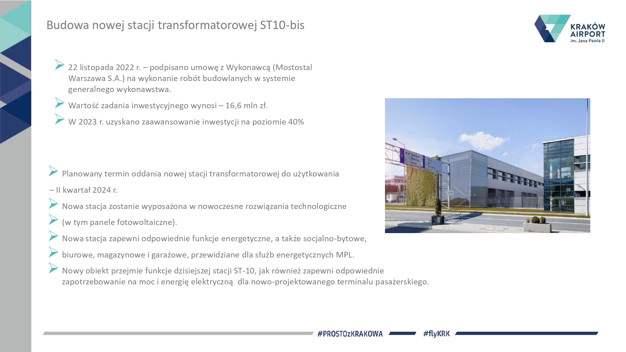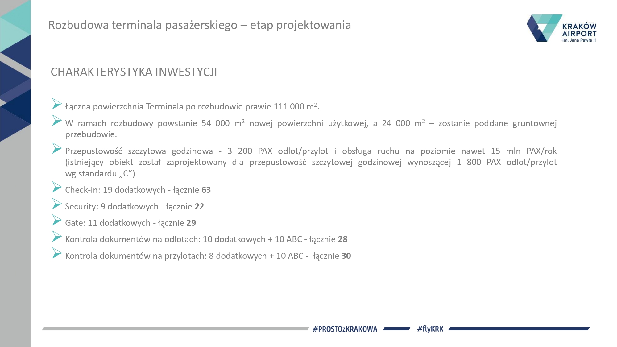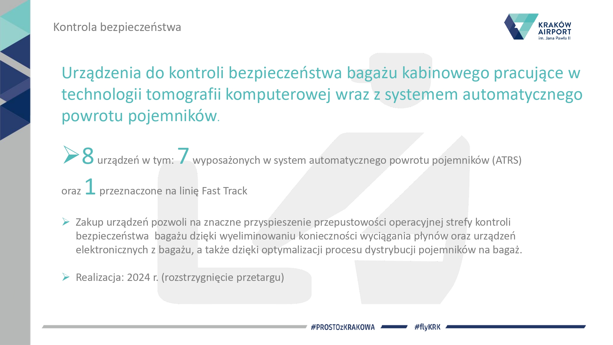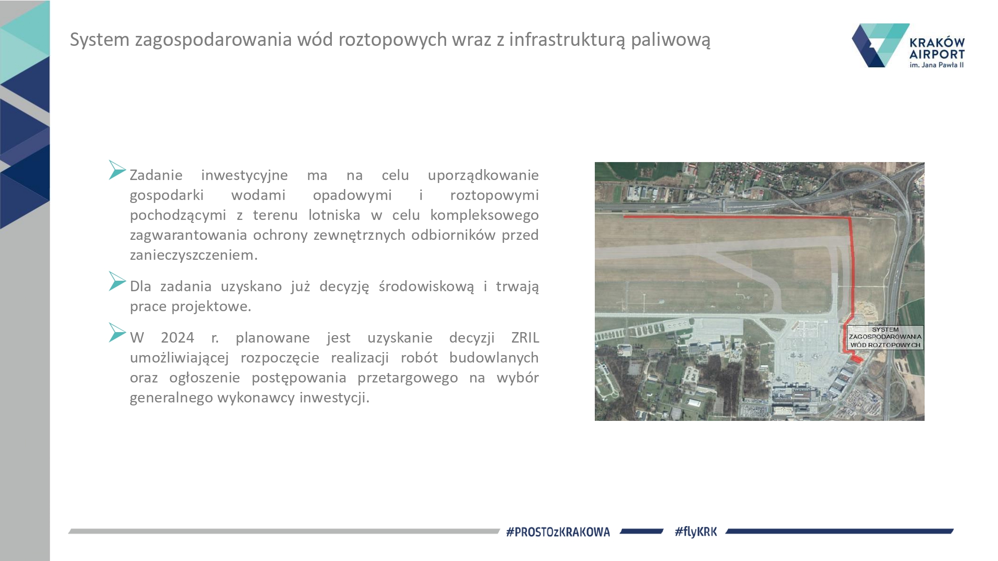 „Konsekwentnie realizujemy inwestycje ujęte w Planie Generalnym lotniska Kraków-Balice. W 2023 rozbudowaliśmy płytę postojową lotniska, trwają zaawansowane prace w budowie terminala cargo i obiektów infrastruktury towarzyszącej.Pod koniec grudnia wspólnicy Spółki Międzynarodowego Portu Lotniczego im. Jana Pawła II Kraków – Balice sp. z o. o. jednogłośnie zaakceptowali przedłożony przez zarząd „Plan Inwestycyjny Kraków Airport na lata 2024 – 2045”. Podjęta decyzja jest podstawą formalną dalszych planów rozwoju krakowskiego lotniska i realizacji Planu Inwestycyjnego na dalsze dekady zgodnie z Planem Generalnym zatwierdzonym w 2018r. Podjęto także uchwałę o wyrażeniu zgody na podjęcie przez Zarząd MPL czynności prawnych związanych z realizacją budowy i rozbudowy terminala pasażerskiego. Jedną z najważniejszych inwestycji pozostaje nowa droga startowa, która ponownie procedowana jest w Regionalnej Dyrekcji Ochrony Środowiska. Czekamy na decyzję, będąc gotowym do rozpoczęcia realizacji powyższej inwestycji. Budowa nowej drogi startowej umożliwia ciągłość funkcjonowania krakowskiego lotniska, bez konieczności jego zamykania na wiele miesięcy. Ta budowa, podobnie, jak rozbudowa terminala pasażerskiego, czy pozostałe projekty będą się toczyły przy nieprzerwanie funkcjonującym lotnisku. To także inwestycja domykająca procedowane rozwiązania systemu gospodarki wodno-ściekowej na lotnisku, a także wdrożenie nowoczesnego systemu naprowadzania samolotów, umożliwiającego prowadzenie operacji lotniczych w warunkach ograniczonej widzialności. – podsumował Radosław Włoszek, prezes Zarządu Kraków Airport.