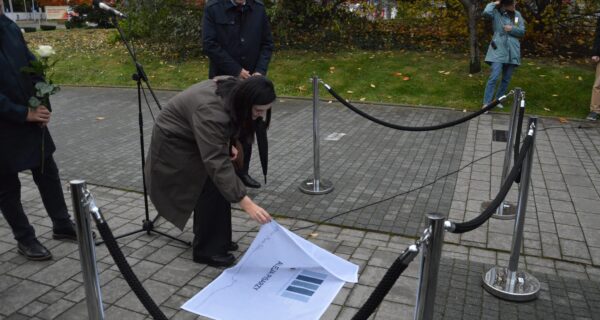 Joanna Kuciel-Frydryszak z tablicą w Alei Pisarzy w Oświęcimiu