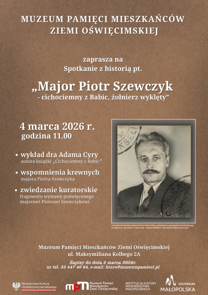 Muzeum Pamięci Mieszkańców Ziemi Oświęcimskiej zaprasza na kolejne wydarzenie z cyklu „Spotkanie z historią”, poświęcone niezwykłej postaci związanej z regionem. Tym razem bohaterem spotkania będzie major Piotr Szewczyk – Cichociemny, żołnierz podziemia niepodległościowego oraz jeden z tych, których dziś nazywamy Żołnierzami Wyklętymi.