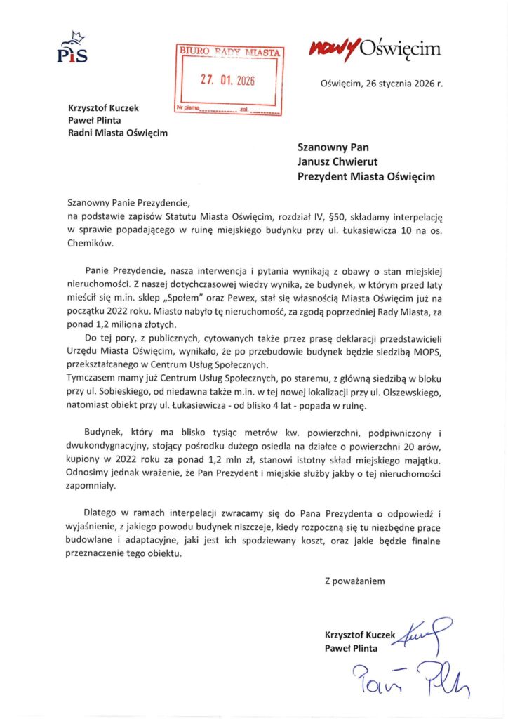 Radni Kuczek i Plinta z klubu PiS – Nowy Oświęcim zwrócili się do prezydenta Oświęcimia Janusza Chwieruta w sprawie popadającego w ruinę miejskiego budynku przy ul. Łukasiewicza na os. Chemików.