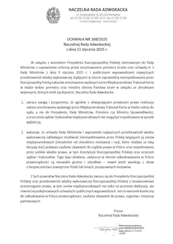 Naczelna Rada Adwokacka w uchwale nr 168/2025 wyraziła stanowczy sprzeciw wobec uchwały Rady Ministrów z 9 stycznia 2025 r., która podważa respektowanie nakazów Międzynarodowego Trybunału Karnego w Hadze. Rada przypomina, że realizacja takich nakazów należy do sądów, a ich niestosowanie podważa zaufanie do polskiego porządku prawnego i praworządności. W apelu do władz wykonawczych Rada wzywa do przestrzegania prawa i umów międzynarodowych jako warunku odbudowy zaufania obywateli do instytucji państwowych.