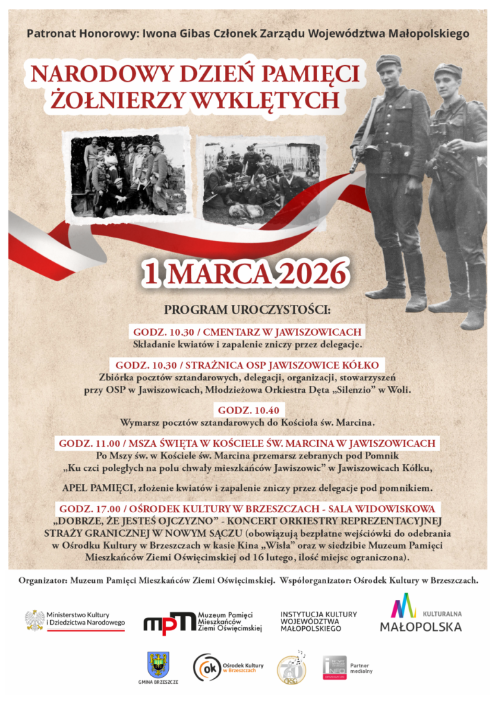 Muzeum Pamięci Mieszkańców Ziemi Oświęcimskiej zaprasza do udziału w obchodach Narodowego Dnia Pamięci „Żołnierzy Wyklętych”, które odbędą się 1 marca 2026 roku w Jawiszowicach. Uroczystość zwieńczy wieczorny koncert Orkiestry Reprezentacyjnej Straży Granicznej w Nowym Sączu, który odbędzie się w siedzibie Ośrodka Kultury w Brzeszczach – współorganizatora wydarzenia.