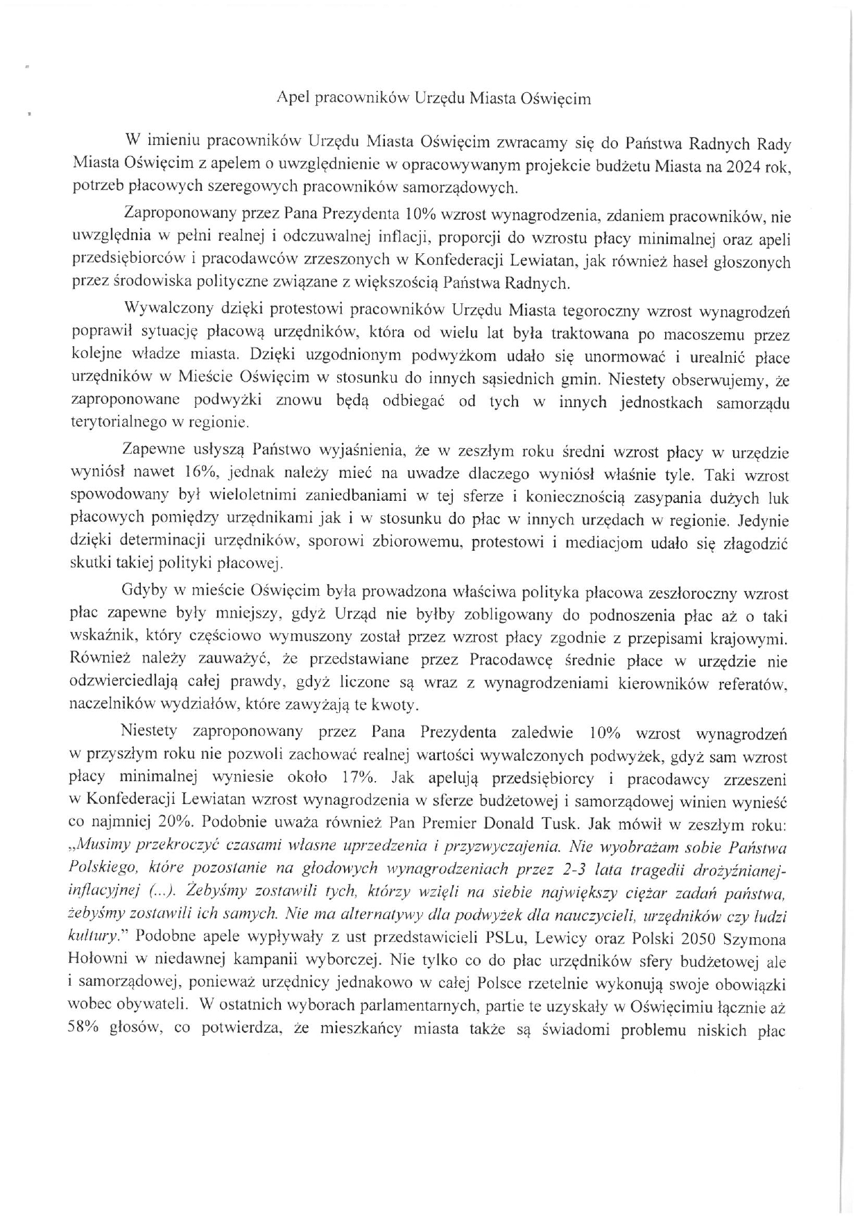 Oto pełna treść apelu pracowników Urzędu Miasta Oświęcim, której nie chciał wysłuchać przewodniczący rady miasta i prezydent Oświęcimia.