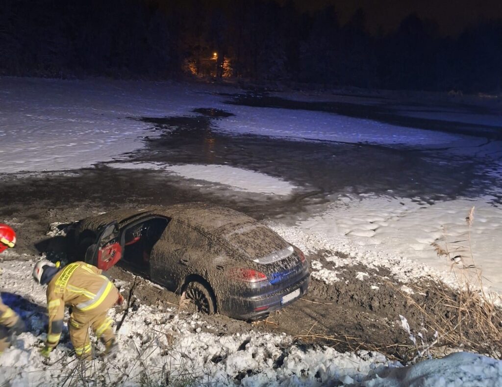 Porsche wypadło z drogi w Grojcu i wpadło do opuszczonego stawu. 38-letni kierowca doznał stłuczeń. Policja apeluje o ostrożność przy jesienno-zimowych warunkach.