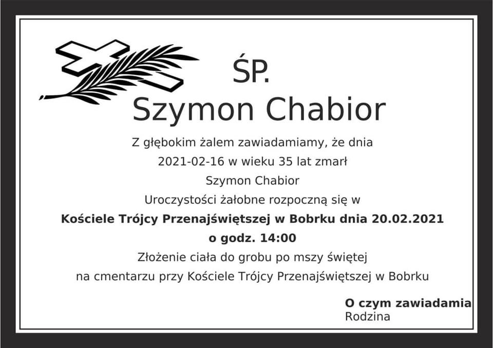 Nie żyje lokalny wydawca i dziennikarz Szymon Chabior (36 lat), właściciel portalu Oswiecimskie24.pl. Śp. Szymon Chabior był znanym w regionie dziennikarzem opisującym i relacjonującym ważne społecznie wydarzenia na terenie województwa, powiatu i miasta Oświęcim.