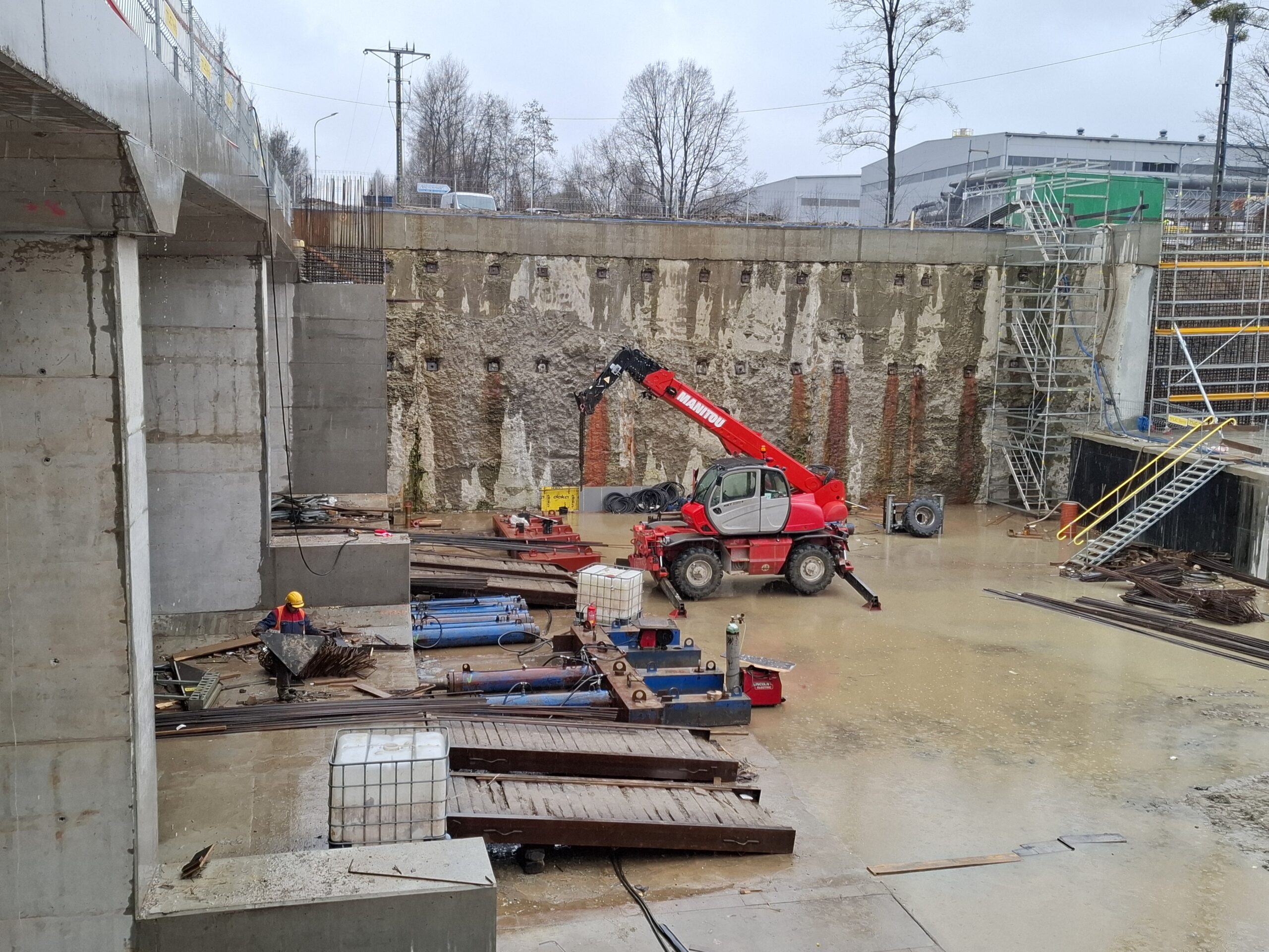 Dodatkowym utrudnieniem jest wysoki poziom wód gruntowych, dlatego zastosowano specjalne podziemne ściany zabezpieczające.