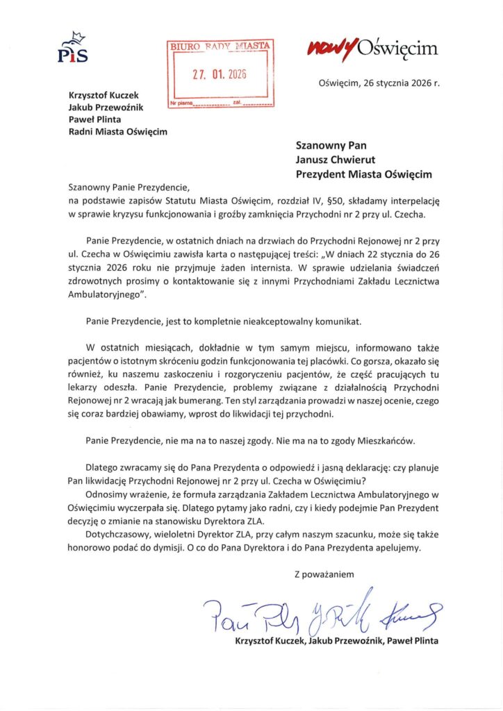 „Panie Prezydencie, problemy związane z działalnością Przychodni Rejonowej nr 2 wracają jak bumerang. Ten styl zarządzania prowadzi w naszej ocenie, czego się coraz bardziej obawiamy, wprost do likwidacji tej przychodni. Panie Prezydencie, nie ma na to naszej zgody. Nie ma na to zgody Mieszkańców” – napisali do prezydenta Janusza Chwieruta, w interpelacji z 27 stycznia, radni Krzysztof Kuczek, Jakub Przewoźnik i Paweł Plinta z PiS-Nowy Oświęcim.