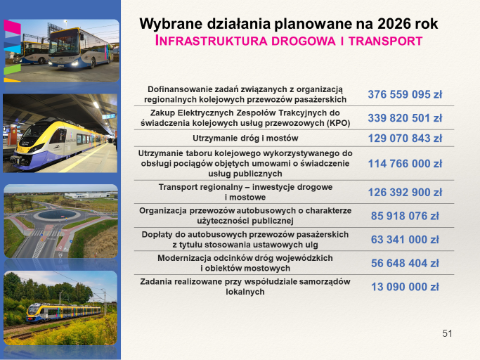 Jednym z kluczowych filarów budżetu pozostaje transport publiczny i infrastruktura drogowa. W 2026 roku Małopolska zakupi kolejne siedem nowoczesnych pociągów dla Kolei Małopolskich, odpowiadając na rosnącą liczbę pasażerów, która w 2025 roku zbliży się do 27 milionów. Równolegle realizowane będą inwestycje drogowe, obejmujące modernizacje dróg wojewódzkich, budowę obwodnic oraz kluczowe połączenia z autostradą A4. Wśród najważniejszych projektów znalazły się m.in. budowa łącznika autostradowego Brzesko – DW 768 oraz nowy most na Dunajcu wraz z połączeniem DW 969 z DK 87.