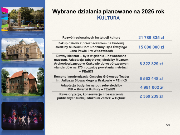 Kultura pozostaje jednym z priorytetów budżetu. W 2026 roku na rozwój instytucji kultury, ochronę zabytków i realizację wydarzeń artystycznych trafi ponad 400 mln zł. Największą inwestycją będzie budowa nowej siedziby Filharmonii Krakowskiej. Kontynuowane będą również remonty zabytkowych obiektów Teatru im. Juliusza Słowackiego, renowacja Zamku Lipowiec oraz projekty muzealne, w tym utworzenie Muzeum Taternictwa i Narciarstwa.