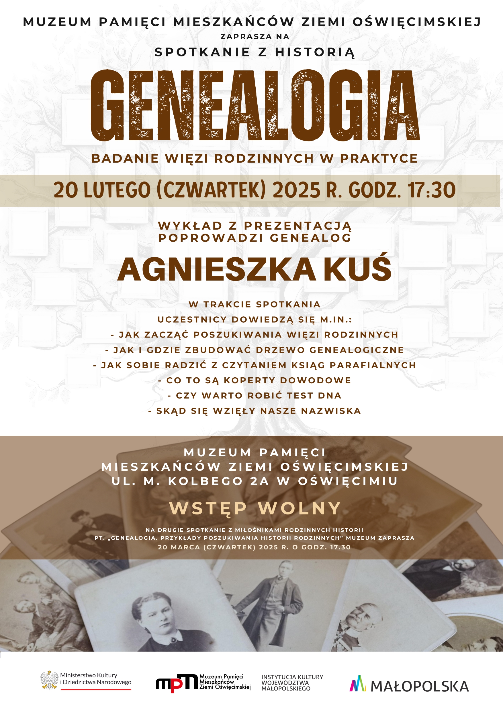 Muzeum Pamięci Mieszkańców Ziemi Oświęcimskiej zaprasza na „Spotkanie z historią” poświęcone badaniu więzów rodzinnych w praktyce. Pierwsze odbędzie się 20 lutego (czwartek) o godz. 17.30. Poprowadzi je dyplomowana genealog Agnieszka Kuś. Wstęp wolny.