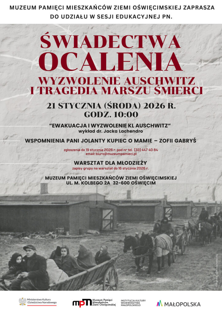 Muzeum Pamięci Mieszkańców Ziemi Oświęcimskiej zaprasza do udziału w sesji edukacyjnej pn. „Świadectwa ocalenia. Wyzwolenie Auschwitz i tragedia Marszu Śmierci”. Rozpoczęcie 21 stycznia (środa) o godz. 10.00. Wstęp wolny.